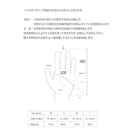 手囲い(“左手の生命線の始点”と、“小指の付け根のシワと手首の付け根のシワを結んだときに手首の付け根のシワのほうから1/3の距離にある点”を通って、ぐるりと手のまわりを一周した長さ) XS:19-20cm S:21-22cm M:23-24cm L:25-26cm